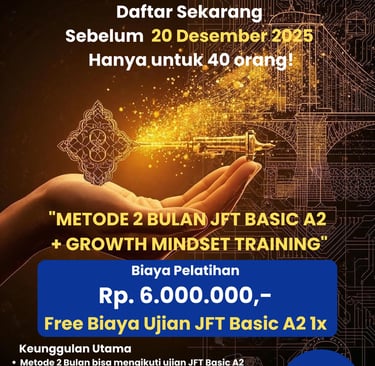 Setiap siswa akan dibimbing hingga siap menghadapi ujian JFT Basic A2 atau JLPT N4, dengan metode yang mudah dipahami, ritme yang terstruktur, dan pendekatan yang menyenangkan.